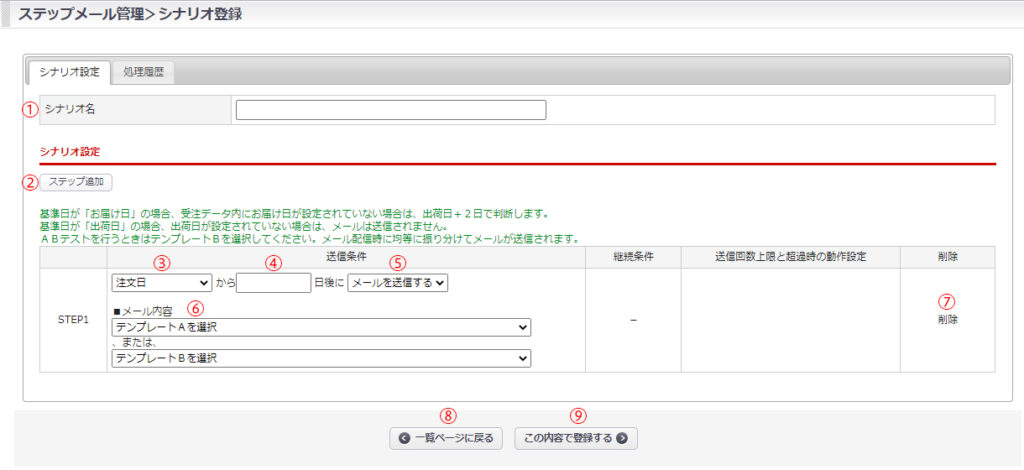 | ③ステップメール配信名 | ステップメール配信管理にて登録した配信名より選択 |