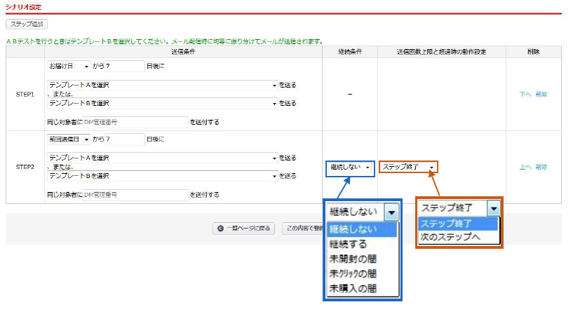 | 次のステップへ | 該当ステップの送信回数、未開封などに関わらず、 送信処理を完了したら次のステップへ進む (STEP1 なら STEP2 へ STEP2 なら STEP3 へ) | |