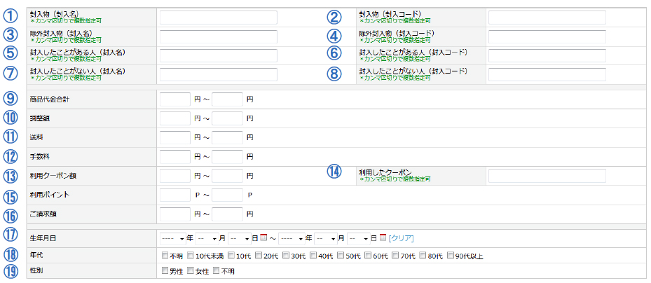 | ⑯除外商品(商品コード) | 購入した商品のうち、検索から除外する商品コードを入力 |