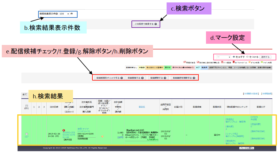 | h.配信履歴削除ボタン | IDの上のチェックボックスにチェックを入れ、「配信履歴削除ボタン」をクリックし、配信履歴の削除を行います |