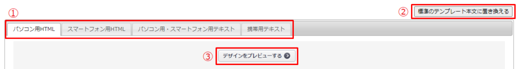 | ①HTML/テキストタブ | 選択した「メール形式」によって、設定するテンプレートの種類が異なります。 ・HTML(4種) パソコン用HTML、スマートフォン用HTML、パソコン用・スマートフォン用テキスト、携帯用テキスト ※受信側がHTMLを受け取らない設定の場合、テキストが配信されます。 ・テキスト(2種) パソコン用・スマートフォン用テキスト、携帯用テキスト |