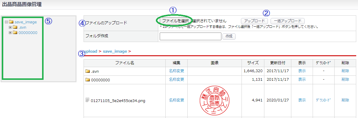 指定のフォルダ内に保存するには、指定のフォルダ名と内部が③表示されていることを確認し、画像データをアップロードする。