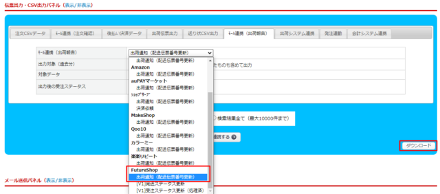 2.伝票出力・CSV出力パネルの 「モール連携(出荷報告)」タブから「FutureShop」の「出荷通知(配送伝票番号更新)」を選択