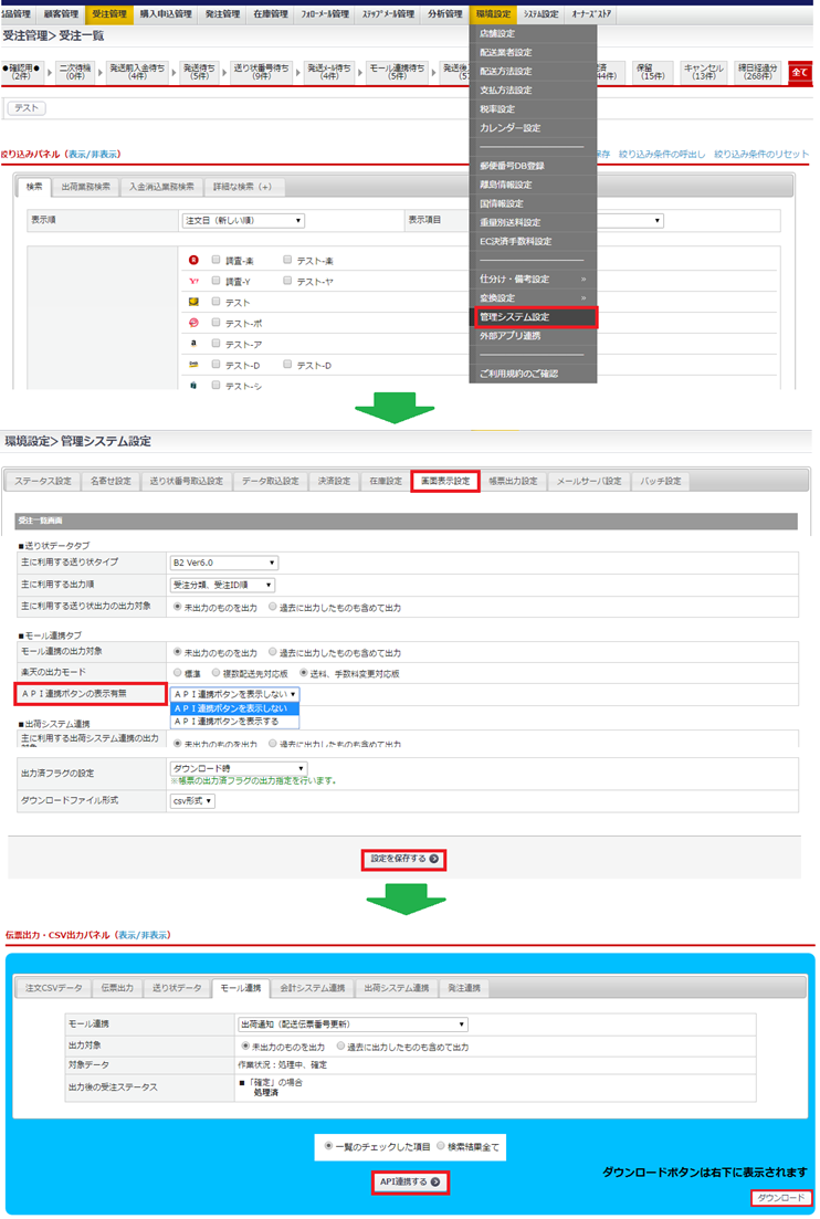 2.■モール連携タブ内の「API連携ボタンの表示有無」にて、