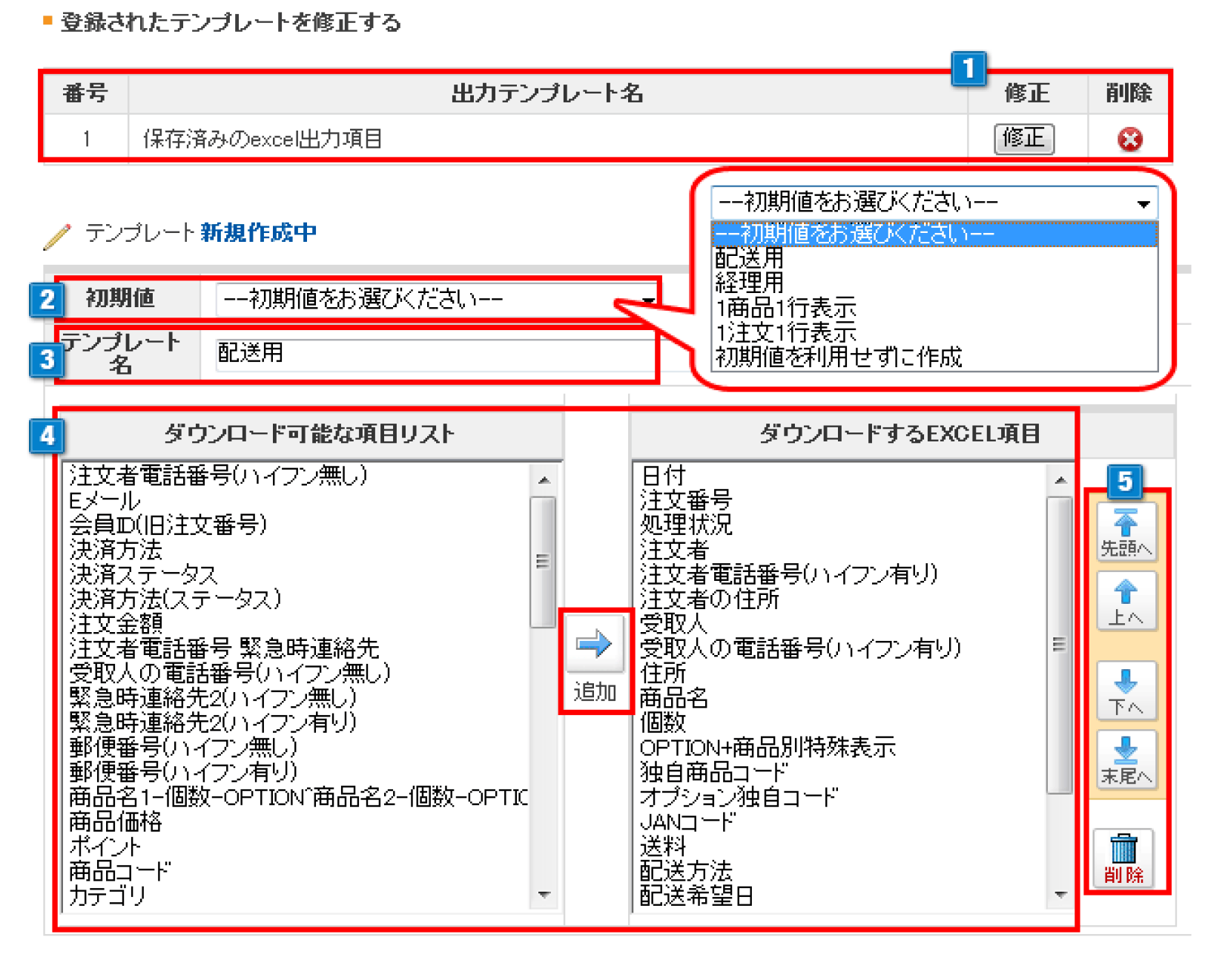 ①.出力テンプレート名‐設定済みのテンプレートがある場合、表示されます。
