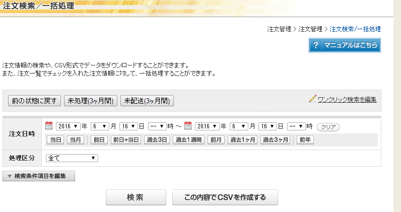 - TOP画面>注文管理>注文検索/一括処理をクリックする