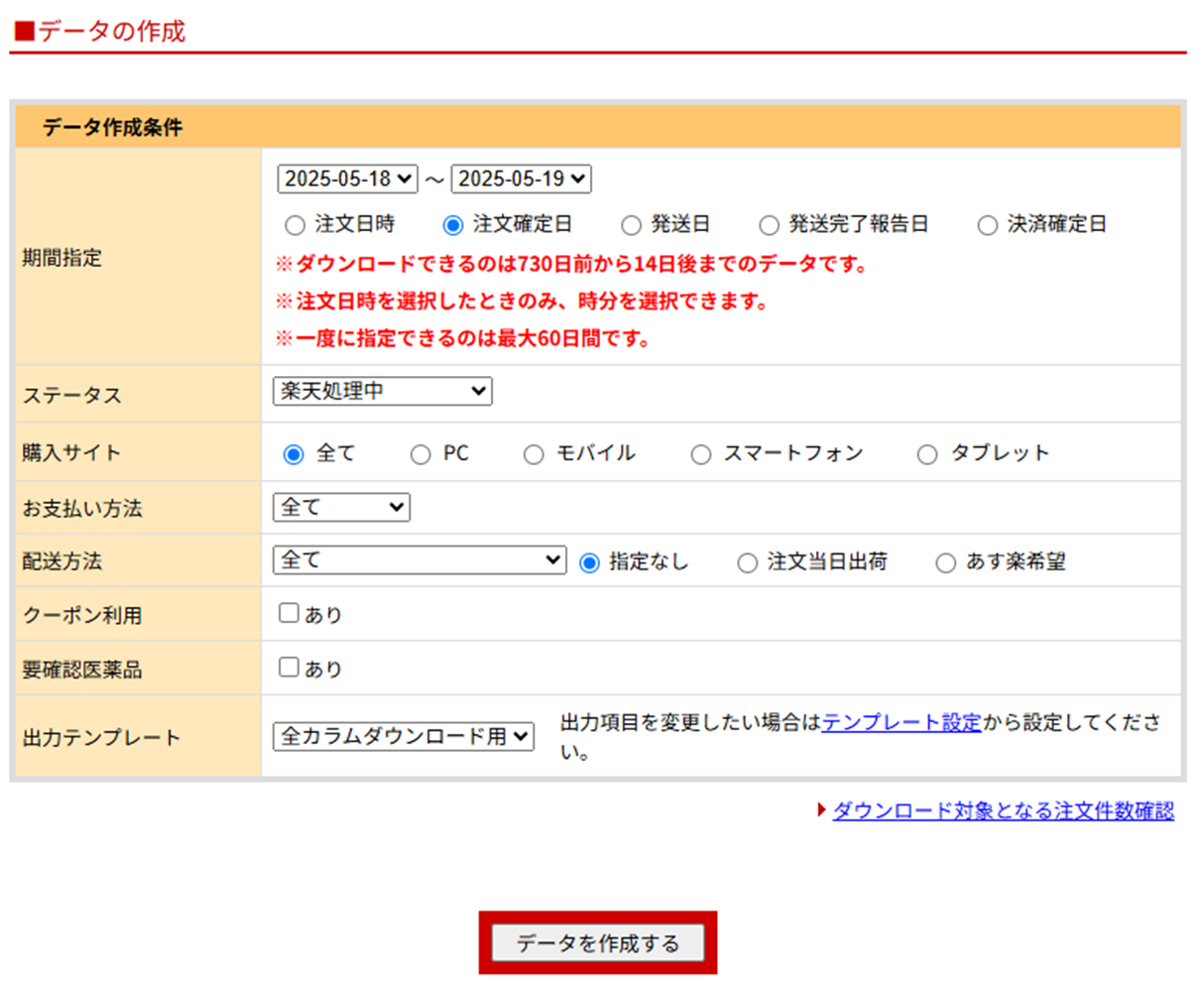 出力テンプレートは[全カラムダウンロード用]を選択してください。