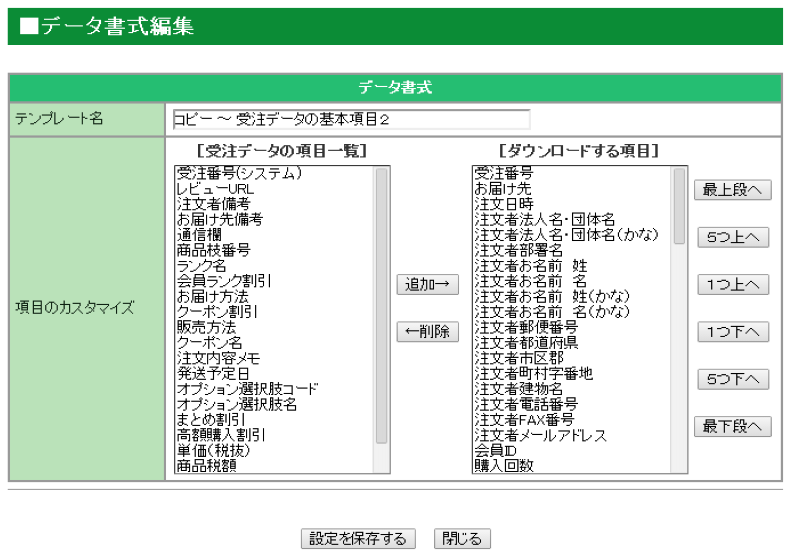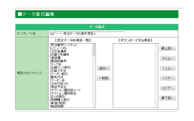 以下の項目は左側(受注データの項目一覧)に残し、それ以外の項目は全て右側(ダウンロードする項目に移動する。