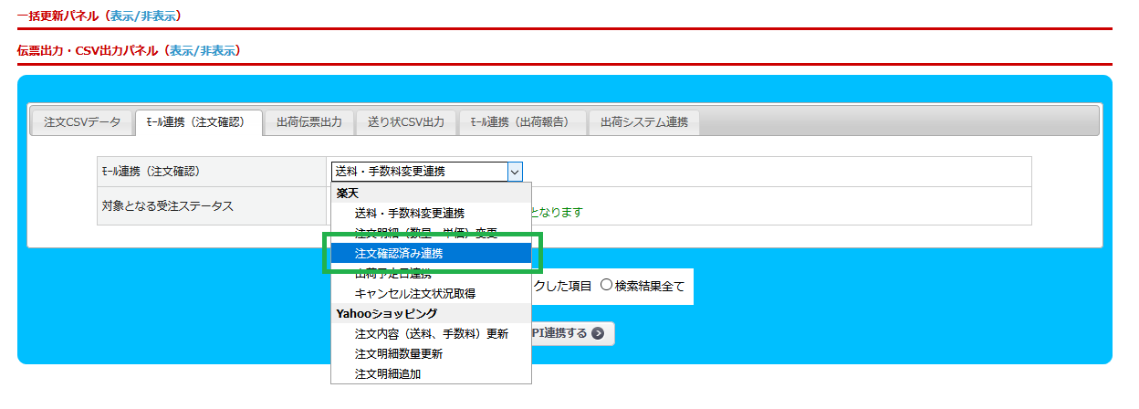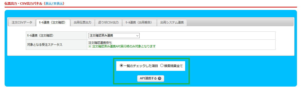 [伝票出力・CSV出力パネル]から、モール連携を実行する