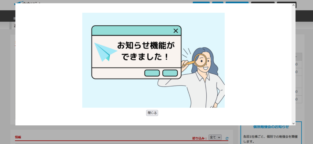 2023年1月16日~ バージョンアップ実施内容 公開日 : 2023年1月16日 / 更新日 : 2025年5月22日 【主な変更内容】 機能改善 管理画面にお知らせ機能が新しく追加されます 弊社からの重要なお知らせやご案内を配信いたします。<重要なお知らせやバージョンアップのお知らせについて>