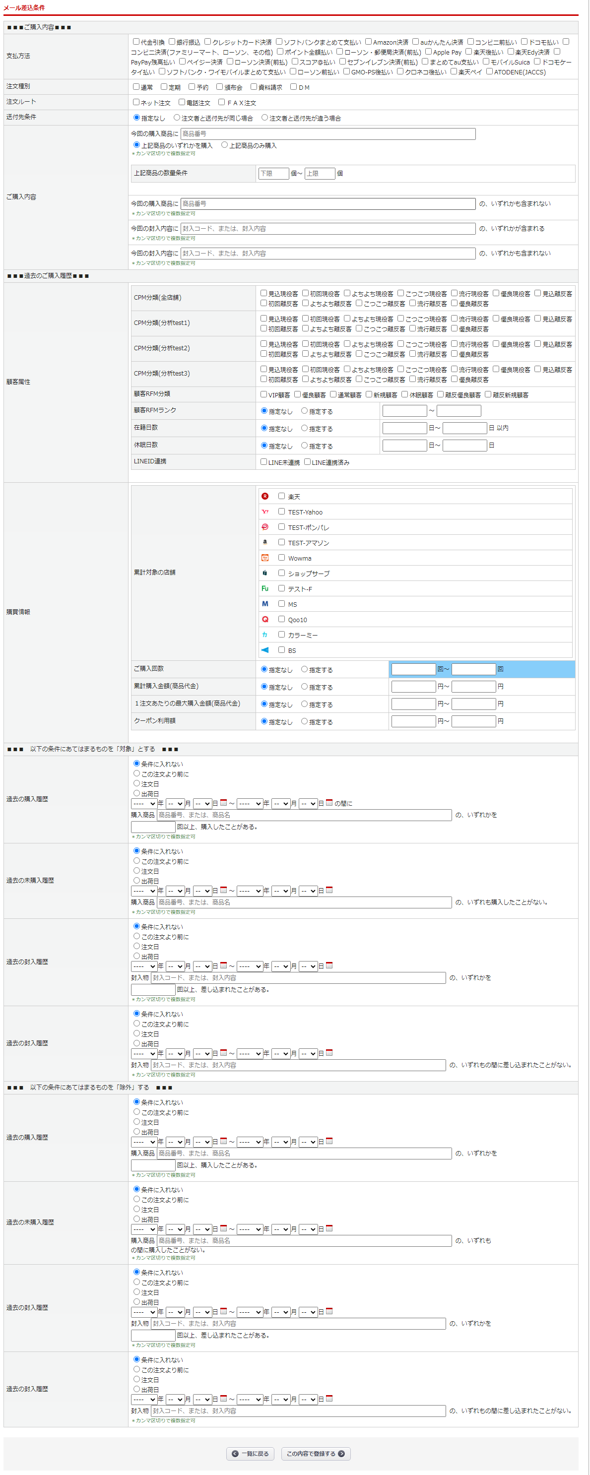 | 過去の未購入履歴 | 過去に特定商品を購入したことがないことを条件に指定する場合に設定します。 期間、商品番号の指定が可能です |