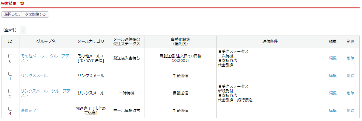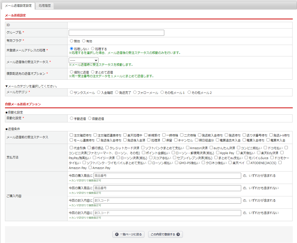 | グループ名 | メール送信設定の新規登録時に設定したグループ名。 |