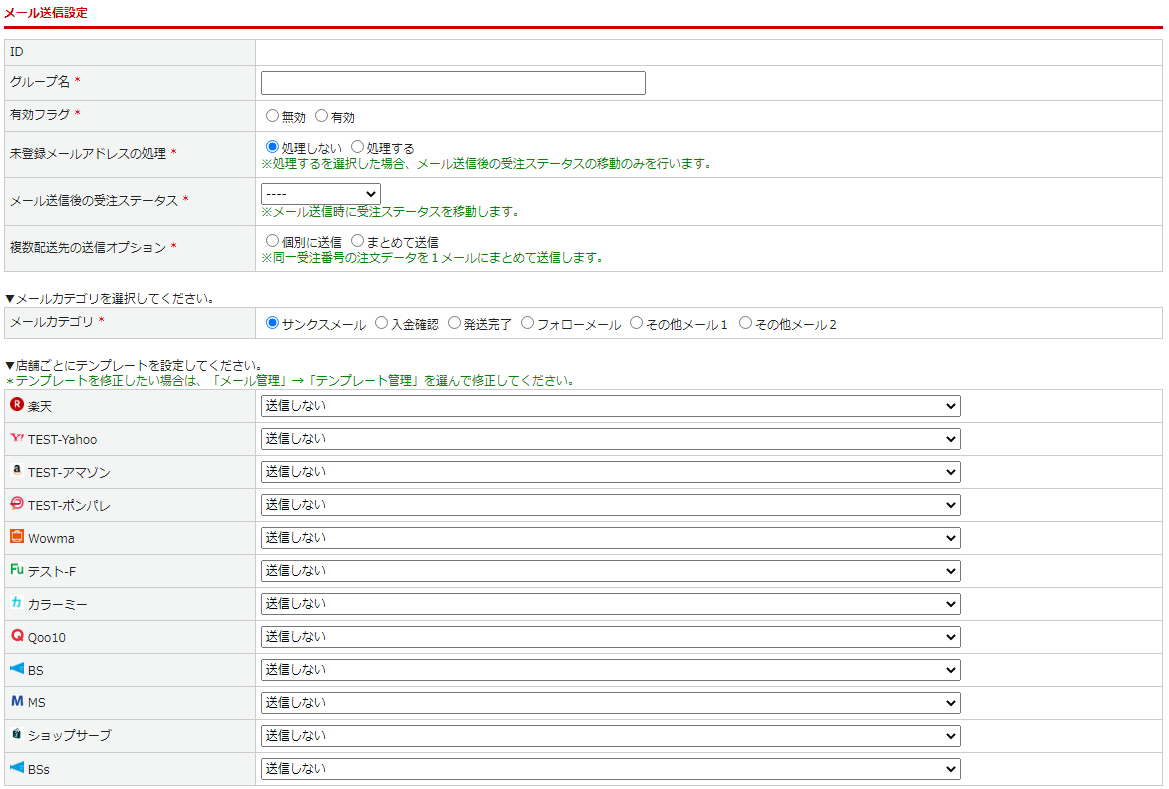 | 店舗ごとのテンプレート設定 | メールカテゴリを選択すると、この設定欄が表示されます。 モールごとに、どのテンプレートを送るのかを選択できます。 |