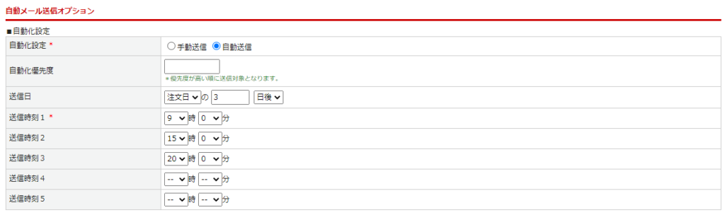 | 自動化設定(優先度) | 自動送信の設定。優先度が高い順に送信対象となります。 |