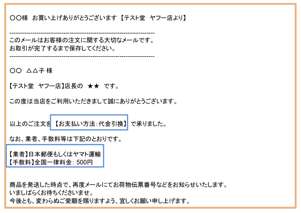 Yahooで受注した注文へのメールは「○○Yahoo店」というショップ名が入ります。