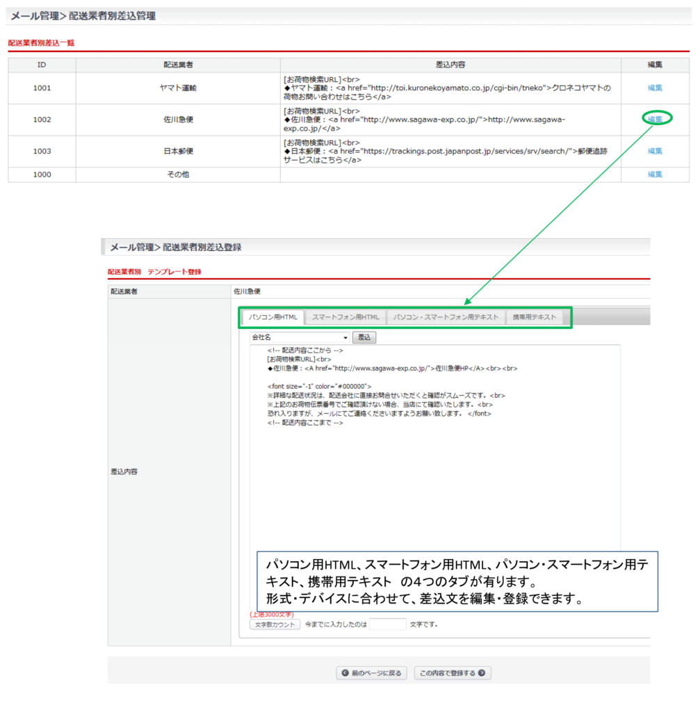 | 自動差込文:配送業者別差込内容 | フォローメール管理>配送業者別差込管理の内容 |
