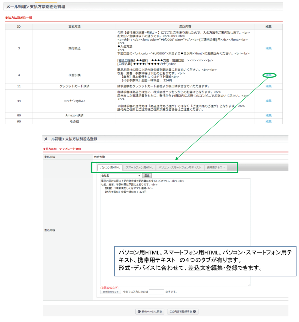 ②それぞれの支払方法別に初期値で差込の雛形が入っているので、必要に応じて「編集」をクリックして編集を行います。