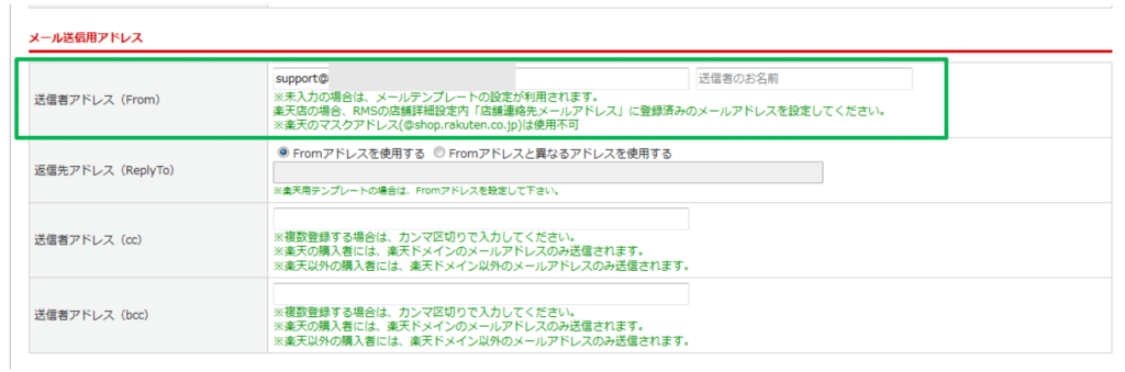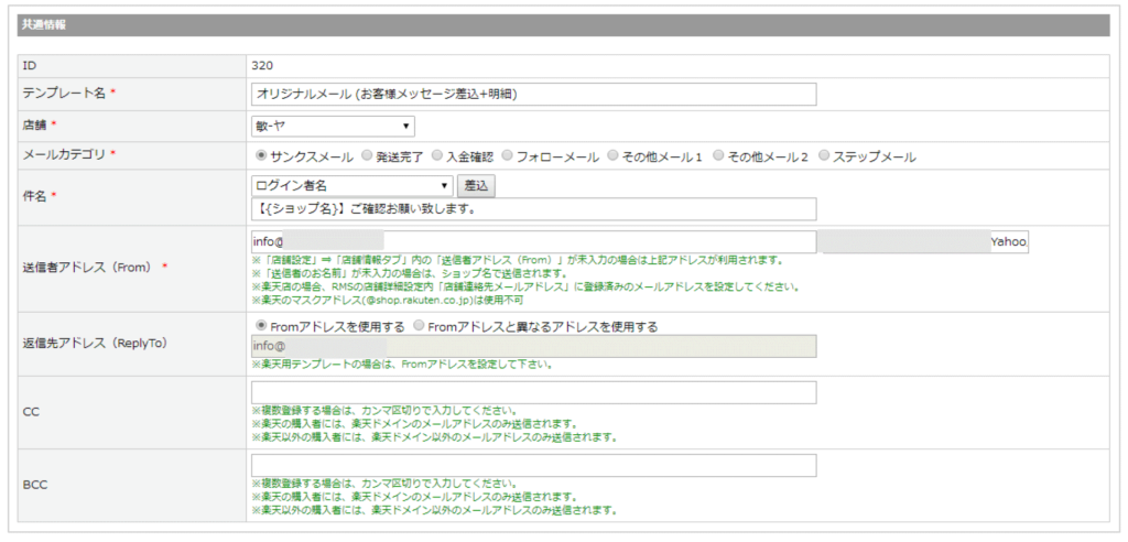 楽天用を含むテンプレートの場合、CC/BCCの欄は空白もしくは、 RMSの店舗詳細設定内の、「店舗連絡先メールアドレス」に登録してある「マスクメールアドレス」をご指定下さい。