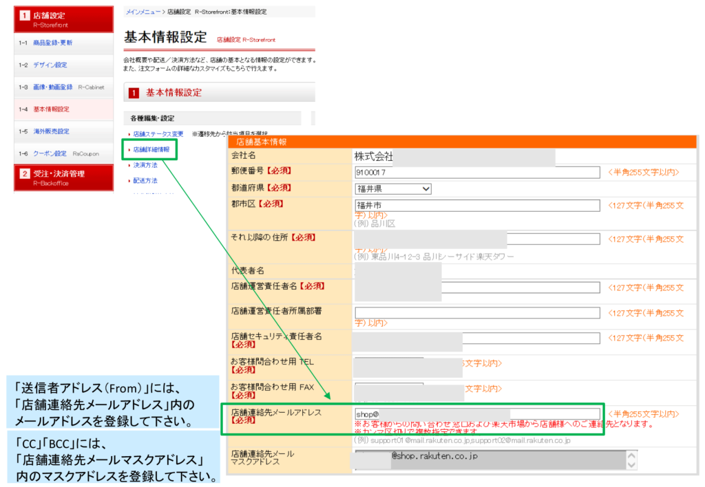 | 送信者アドレス(From)・ 送信者のお名前 | 送信元のアドレスと、送信者の名前を設定します。 (「送信者のお名前」が未入力の場合は、ショップ名で送信されます) ●対象店舗が【全店共通】で、各店舗ごとに送信元のアドレスを変更したい場合 こちらの項目に共通のメールアドレスを設定したうえで、各店舗の店舗設定より メールアドレスをそれぞれ設定してください。 (「店舗設定」⇒「店舗情報タブ」内の「送信者アドレス(From)」) ※次ページ画像参照 ●楽天店のメールアドレスを設定する場合 RMSの店舗詳細設定内「店舗連絡先メールアドレス」に登録済みのメールアドレスを 設定してください。 ※楽天のマスクアドレス(@shop.rakuten.co.jp)は使用できません。 ※次ページ画像参照 |