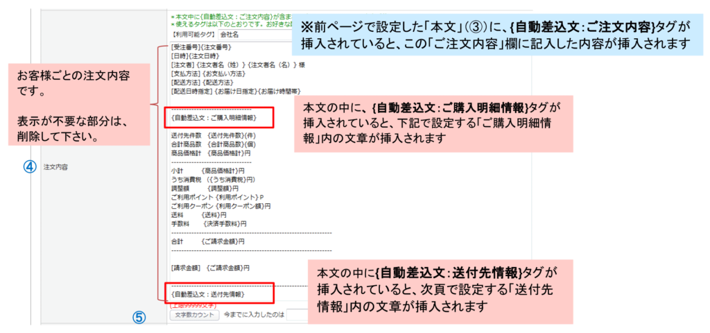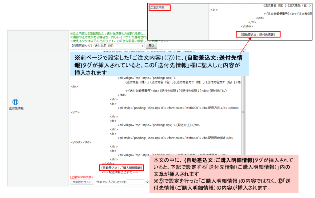 ※㉑~㉘:受注一覧>注文番号をクリックして開く別ウインドウ(注文詳細情報)内に記載されている該当情報が、差込タグを入れることで表示されます。