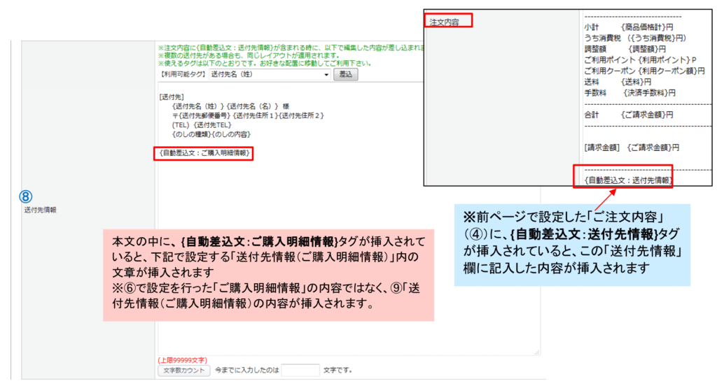 | ㊸自動差込文:ご注文内容/送付先情報 | メールテンプレート内「ご注文内容」/「送付先情報」に記載の内容を表示 |