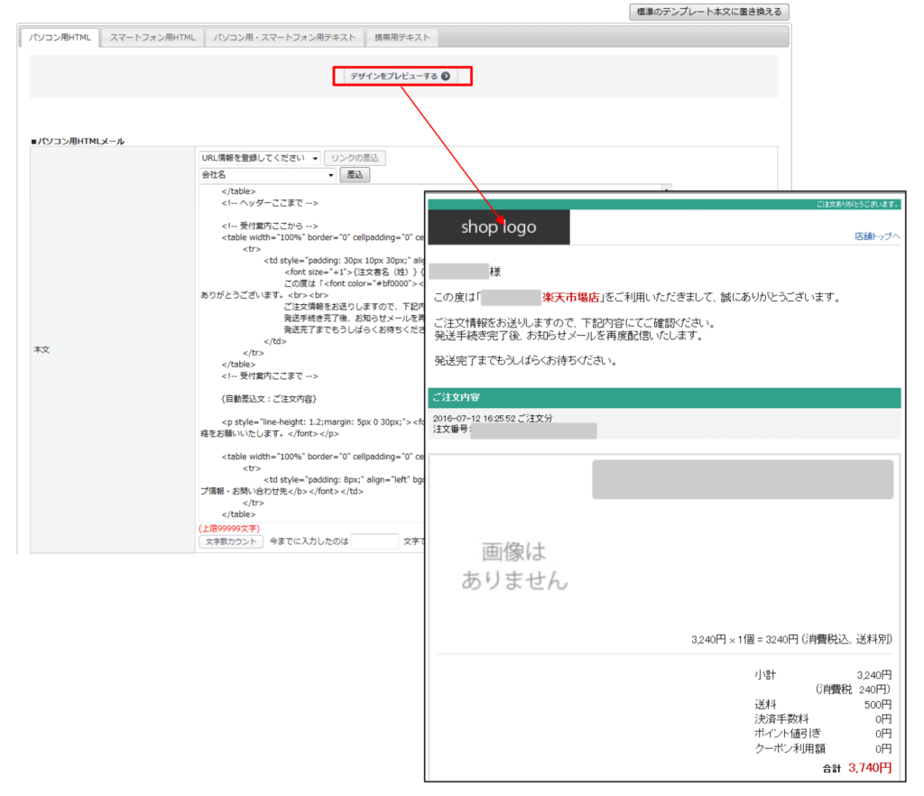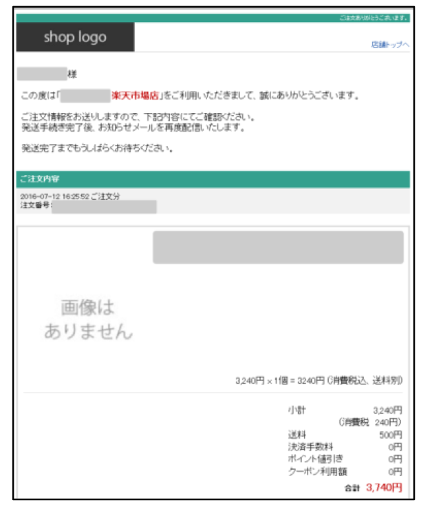※メールには各モールごとに「店舗設定」にて設定されている内容が表示されます。(例:ショップ名が「○○楽天店」「○○Yahoo店」と店舗ごとに異なる場合、差込タグ{ショップ名}を入れることで、楽天で受注した注文へのメールは「○○楽天店」。