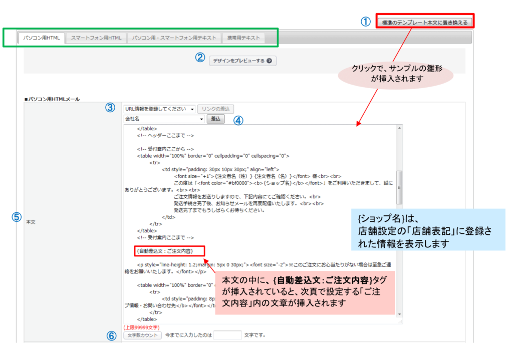 | ①標準のテンプレート本文に置き換える | クリックすると、本文をサンプルの雛形に置き換えが可能です。 |