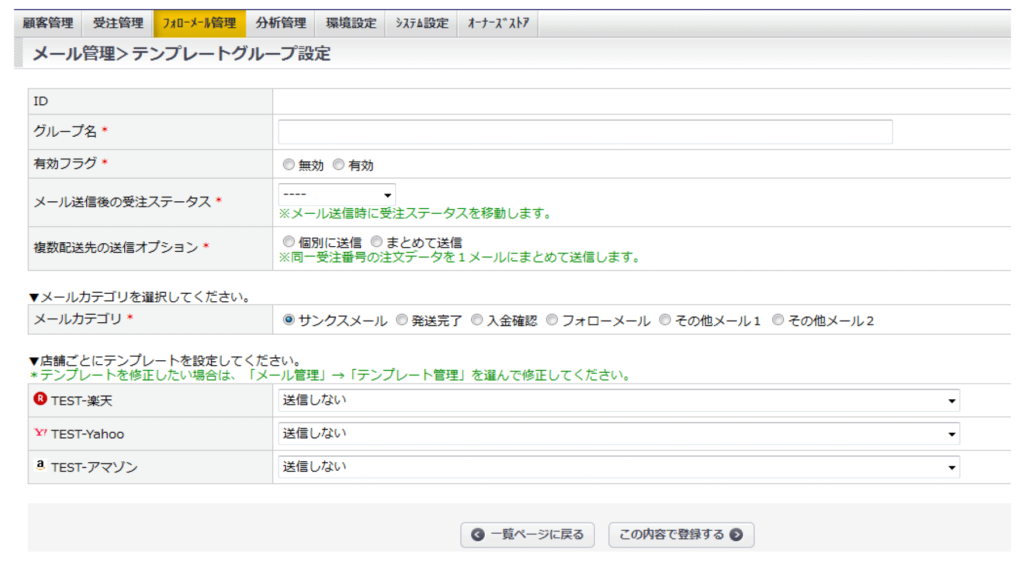 ※サンクスメール、入金確認メール、発送完了メールの全てのテンプレートグループを作成して下さい。