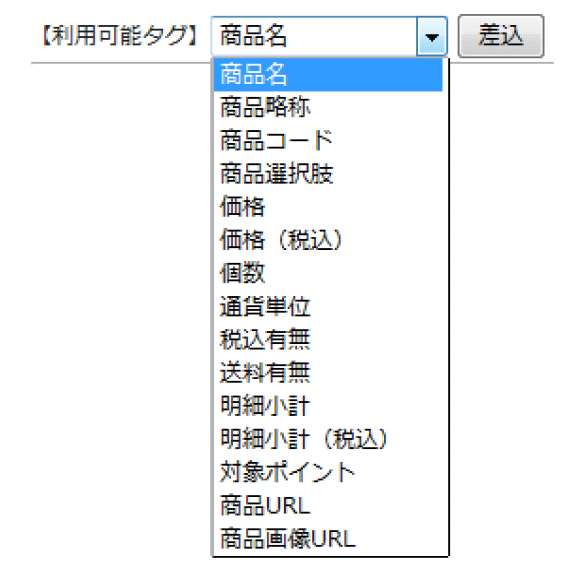 | 自動差込文:ご購入明細情報 | メールテンプレート内「送付先情報(ご購入明細情報)」 |