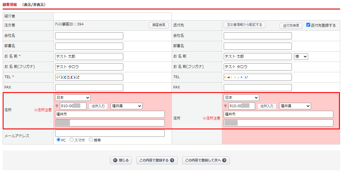 受注>受注登録 の顧客情報に正しい住所を入力することで表示されなくなります。
