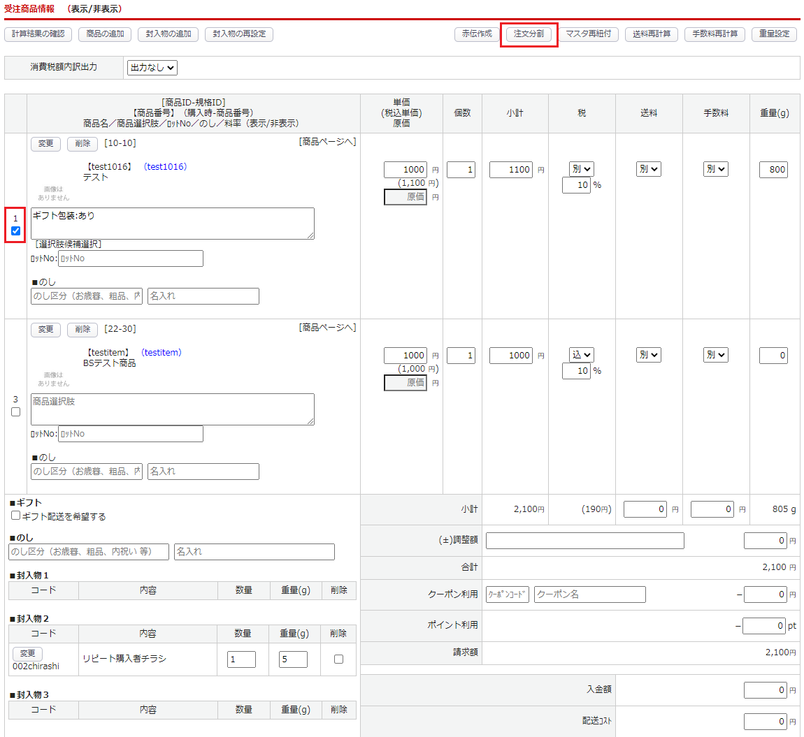 →購入商品が1種類で2個お買上の場合は、1明細である為、そのままでは注文分割が出来ません