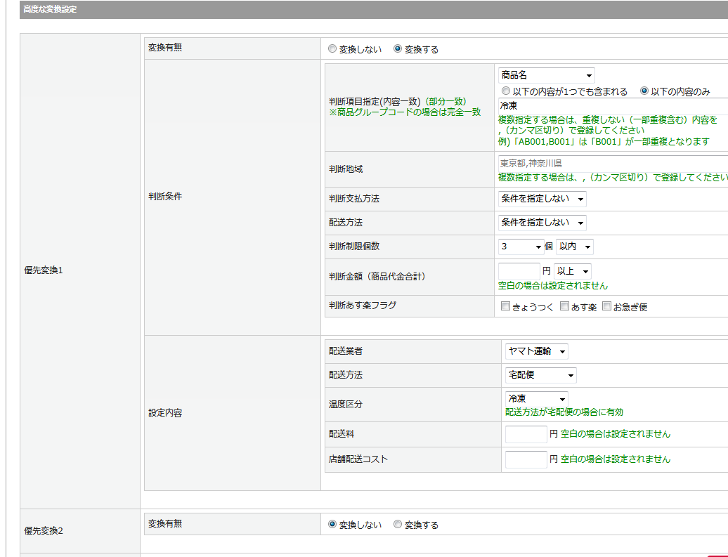 環境設定>店舗設定>配送方法設定タブ内>配送方法変換・送料設定>高度な変換設定 の「優先変換」の場合