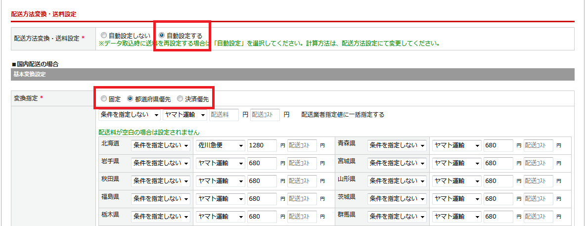・都道府県優先にて、「北海道」は「日本郵便」、「青森県」は「ヤマト運輸」という設定をしていた場合、送り先が北海道なら自動的に日本郵便になります。