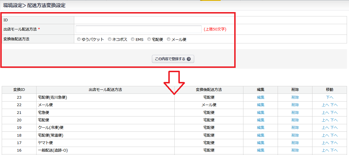 環境設定>変換設定>配送方法変換設定 の場合