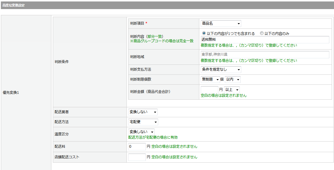 2.配送方法設定タブ内 「高度な変換設定」の「優先変換」にて下記のように設定