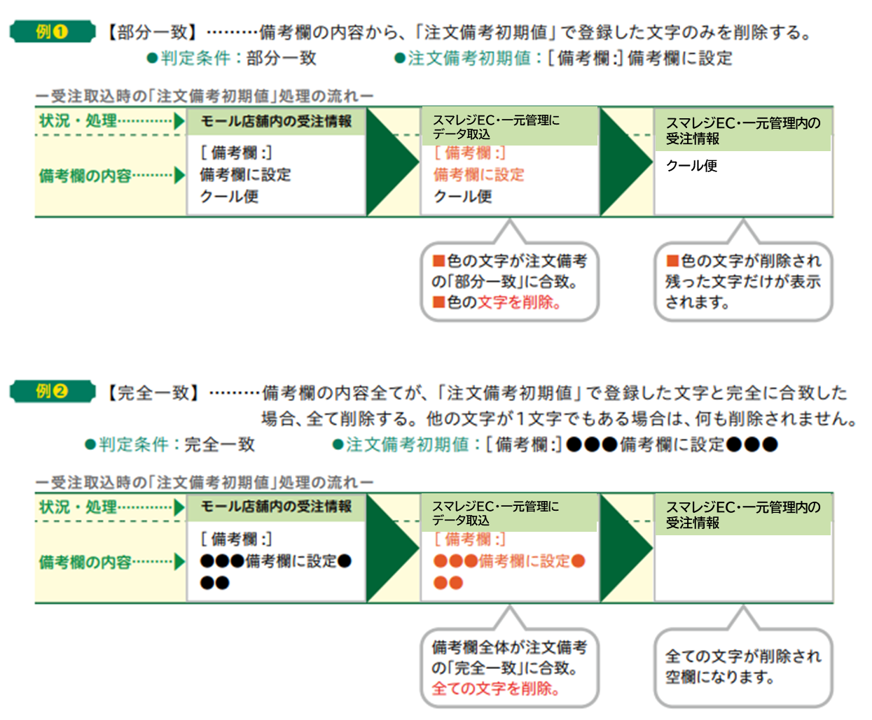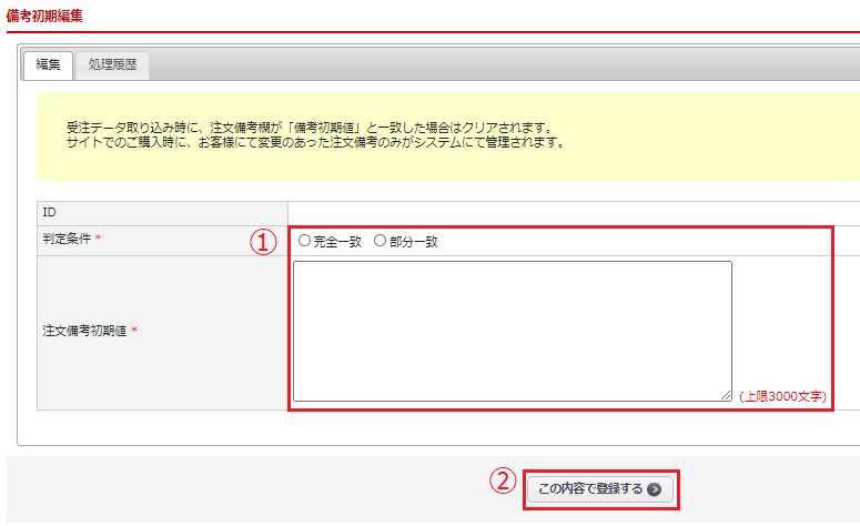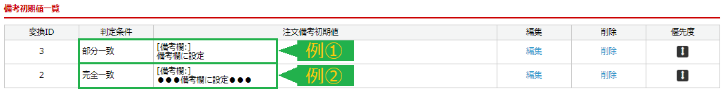 受注データ取込時に、注文備考欄の内容が「備考初期値」と一致した場合、その部分が削除されます。