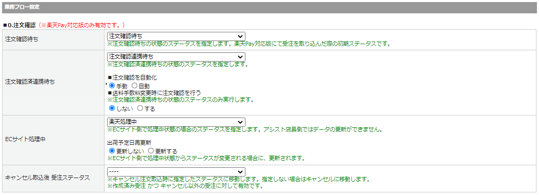 | 注文確認待ち | 注文確認待ちの状態のステータスを指定します。 楽天Pay対応版にて受注を取り込んだ際の初期ステータスです。 |
