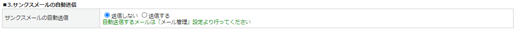 | サンクスメールの自動送信 ※2 | サンクスメールを自動送信する場合は「送信する」、 送信しない場合は「送信しない」を選択してください。 サンクスメールは、注文時に自動配信される「注文確認メール」とは別です。 ※発送完了メール、入金確認メール、フォローメール、フォローメール(その他1)、フォローメール(その他2)の自動送信も同様の設定になります。 |