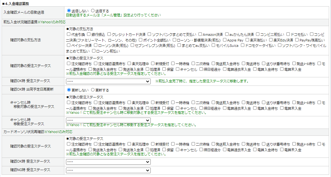 | OK時 受注ステータス | ショップサーブのみ対応しております。 モール連携後の移動先受注ステータスを指定します。 |