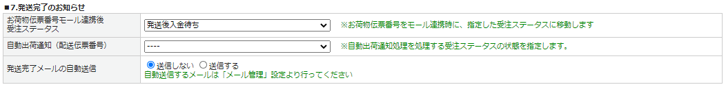 | 発送完了メールの自動送信 | 「送信しない」「送信する」から指定します。 |