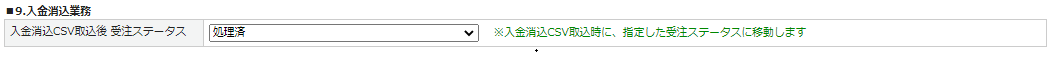 | 入金消込CSV取込後 受注ステータス | 入金消込CSV取込後の移動先受注ステータスを指定します。 |
