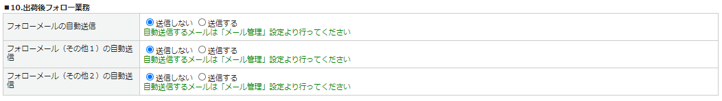 | フォローメールの自動送信 | 「送信しない」「送信する」から指定します。 |