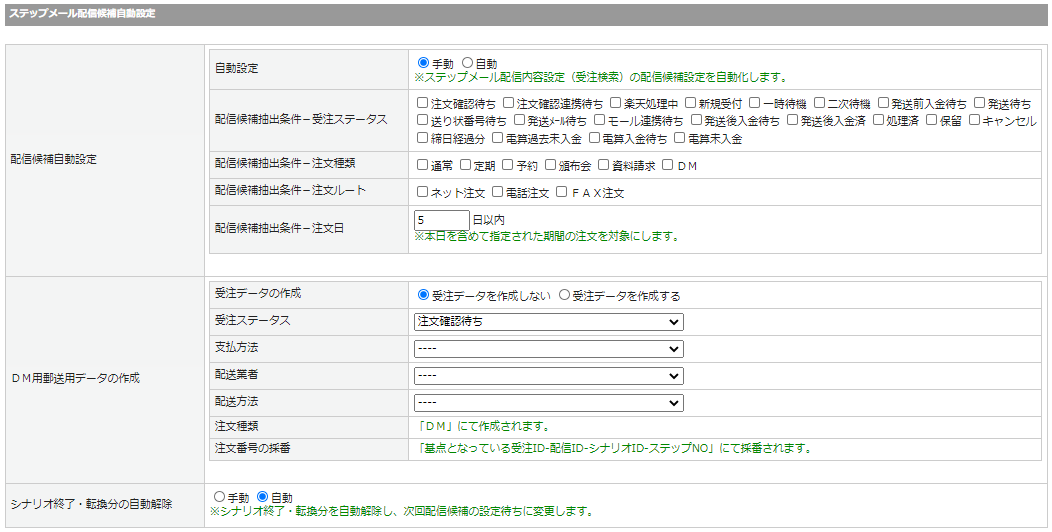 | シナリオ終了・転換分の自動解除 | シナリオ終了・転換分を自動解除し、次回配信候補の設定待ちに変更します。 「手動」「自動」から指定します。 |