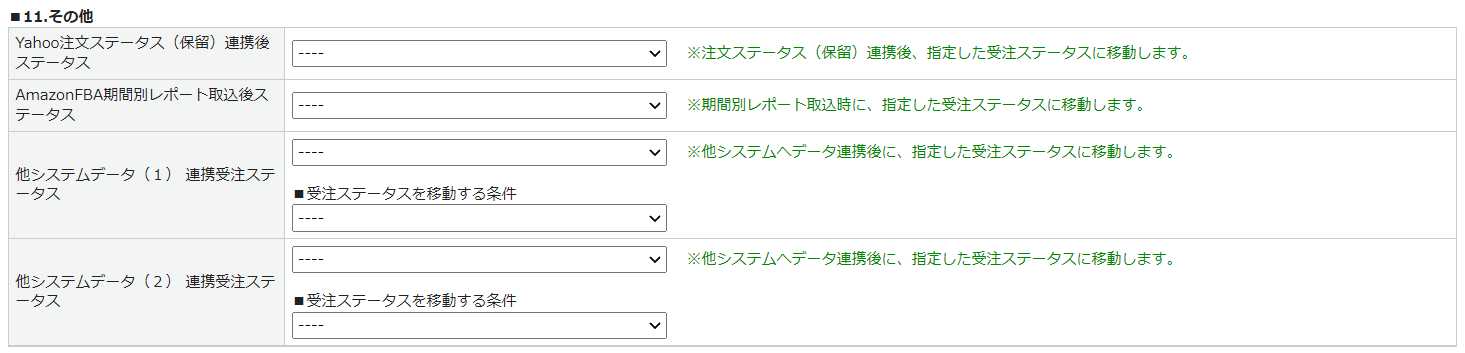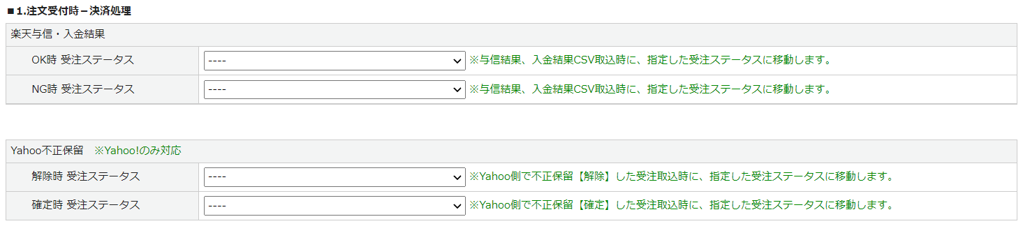 | 解除時 受注ステータス | Yahoo側で不正保留【解除】した受注取込時に、指定した受注ステータスに移動します。 |