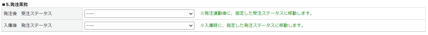 | 発注後 受注ステータス | 発注連動後の移動先受注ステータスを指定します。 ※こちらはオプション機能(有償)です。 ご利用をご希望の場合にはサポートまでお問合せください。 |