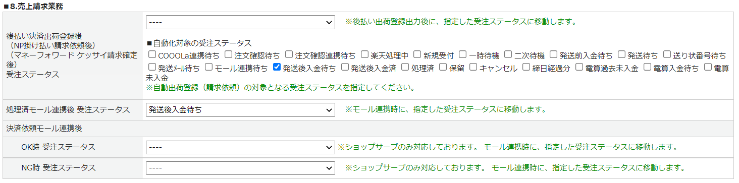 後払い請求情報取得後の移動先受注ステータス、および、 自動請求情報取得の対象となる受注ステータスを指定します。 |