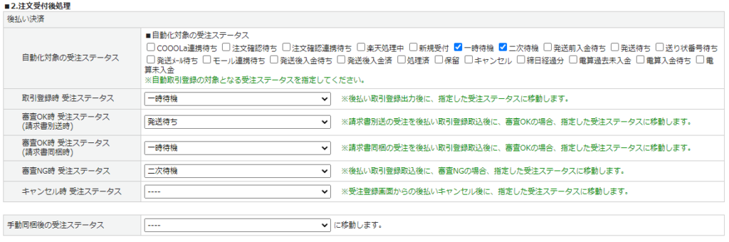 | 取引登録時 受注ステータス | 後払い取引登録出力後の移動先受注ステータスを指定します。 |