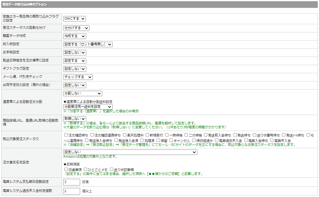 | 顧客データ作成 | 受注データ取り込み時に注文者情報を顧客データとして作成する・しないを指定します。 |