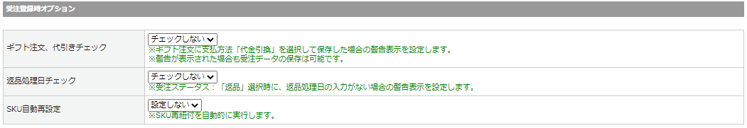 | ギフト注文、代引きチェック | ギフト注文、代引きチェックを利用する・しないを指定します。 ※ギフト注文に支払方法[代金引換]を選択して保存した場合の 警告表示を設定します。 ※警告が表示された場合も受注データの保存は可能です。 |