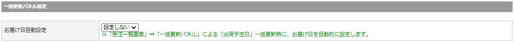| お届け日自動設定 | お届け日を自動設定する・しないを指定します。 ※「受注管理>受注一覧:一括更新パネル」の[出荷業務]タブにて 「出荷予定日」項目を記入し【この内容で更新する】ボタンをクリックすると、 お届け日が自動的に設定されます。 |